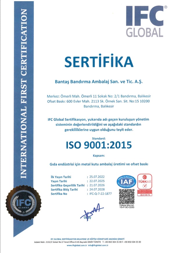 ISO 9001-2015 Kalite Yönetim Sistemi, çerçevesinde, teneke kutu ambalaj hammaddemiz olan teneke levhanın; fabrikamıza girişinden, nihai ürün olarak çıkışına kadar olan tüm proseslerde ve sevkiyat işlemleri sırasında tamamlanması, izlenebilirliği ve kontrolü sağlanmaktadır.